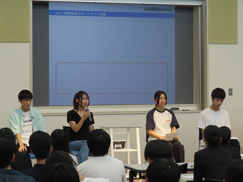 続いて行われた「内定者インタビュー」では、26卒の就職内定者が登壇。企業研究の方法や内定先を選んだ決め手、就活へのアドバイスなどを語り、後輩たちへエールを送りました。