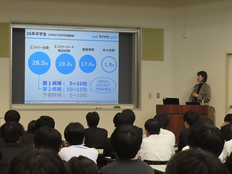 当日は、株式会社マイナビ様より「就活に向けての準備」、就職支援課スタッフより、「就活スケジュール」などの説明が行われ、学生たちは就活の全体像をつかむことができました。