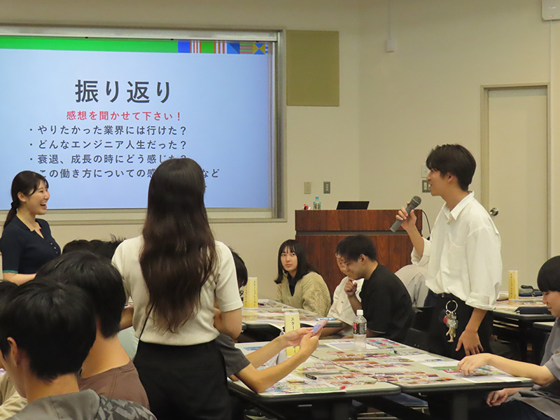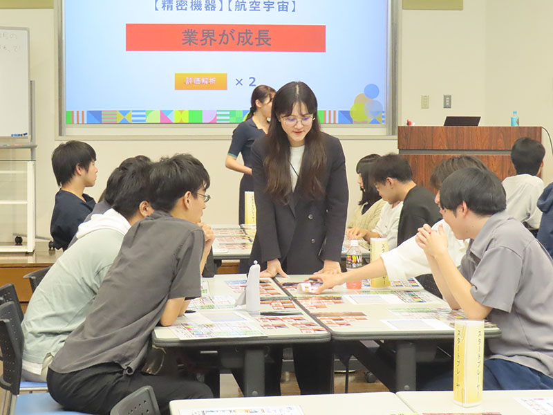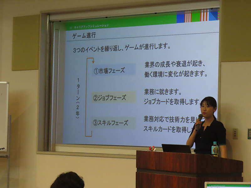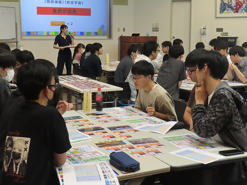 学生たちは、自分のやりたい仕事や身につけたいスキルに応じて業務カードを選び、ゲームを進めていきました。 「この仕事にはどんなスキルが必要だろう?」「希望の業界に就職できた!」と、真剣に悩みながらも楽しみながら取り組んでいました。
