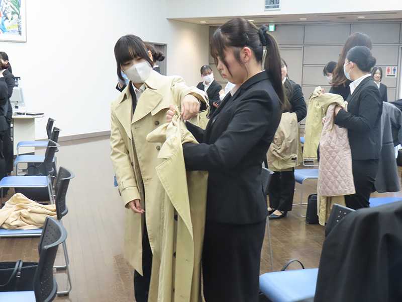 コートの着脱では、入室前にスマートに脱ぐタイミングや腕に掛ける際の美しい形も練習。