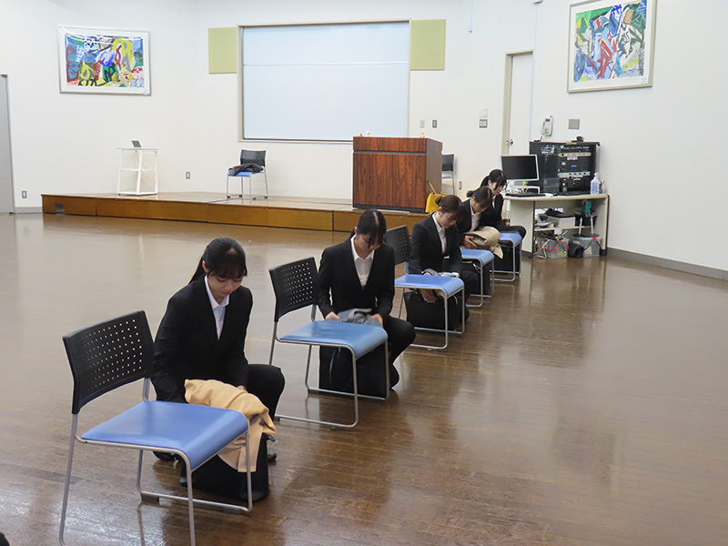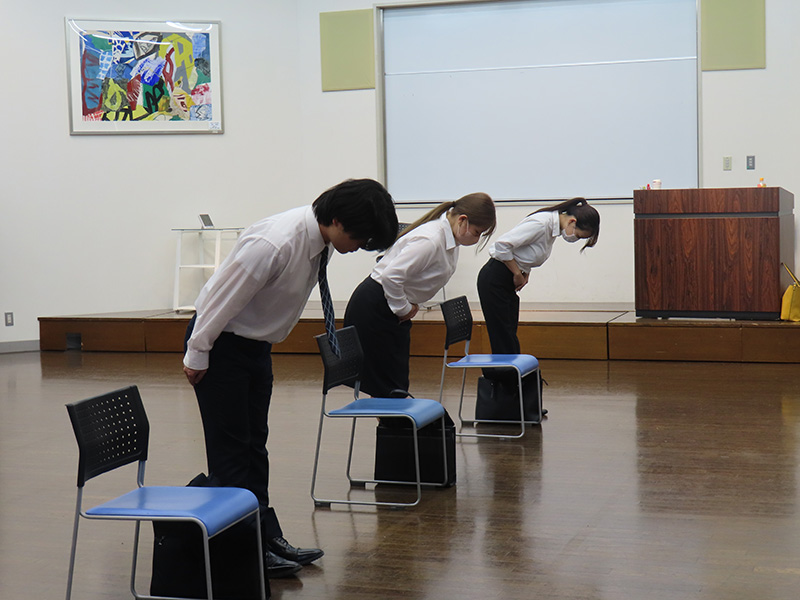 面接試験を想定した入退室の練習ではノックの回数や声掛け、ドアの開閉時の姿勢、鞄の置き方など、細部まで丁寧に取り組みました。