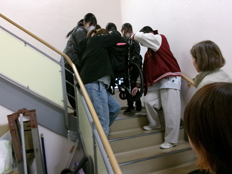 屋外での移動や階段での対応など、医療現場で役立つスキルを体験しながら学ぶことができました。