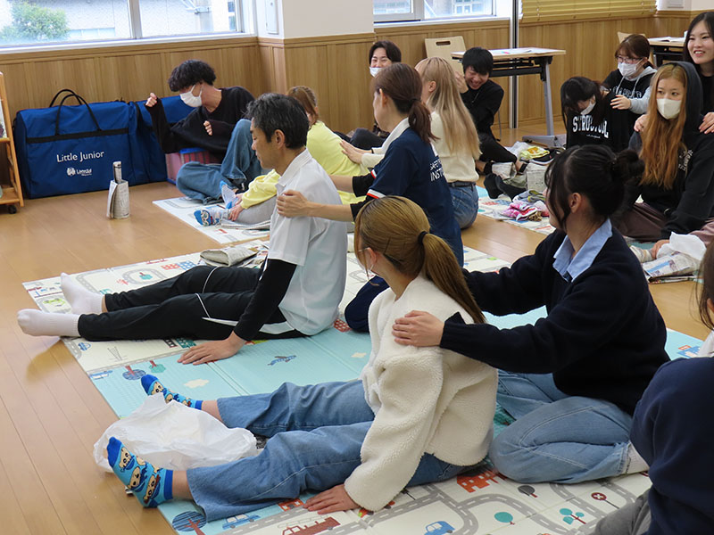 実技では、人形を使った心肺蘇生や、身近なものを使った応急手当の練習に加え、簡単なスキンシップによるリラクゼーションの方法も学びました。血行を促し、安心感を与えるタッチケアは、保育の現場で子どもとの信頼関係を築くうえでも大切なスキルです。