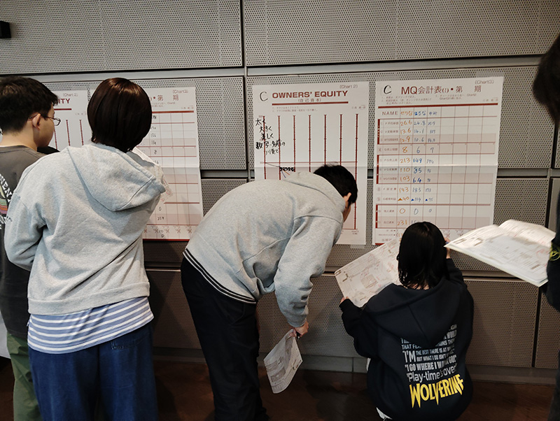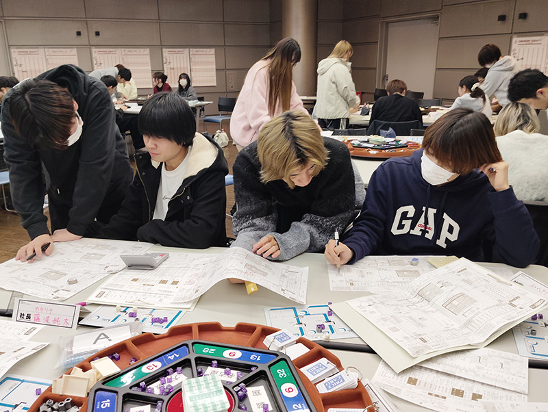 学生一人ひとりが製造業の会社の社長となり、材料の仕入れから商品製造、競りによる販売、そして決算までを一連の流れとして体験。実際の企業活動に近い形で経営をシミュレーションしました。