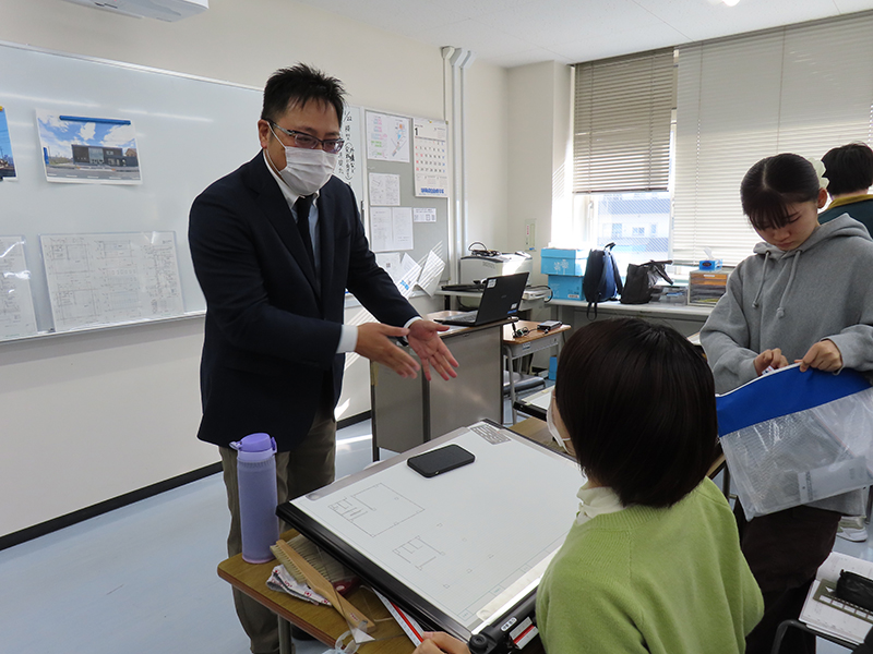 講師の先生には、学生一人ひとりが描いた図面を確認していただき、線の強弱やレイアウトの工夫など、実務にもつながる視点からアドバイスをいただきました。