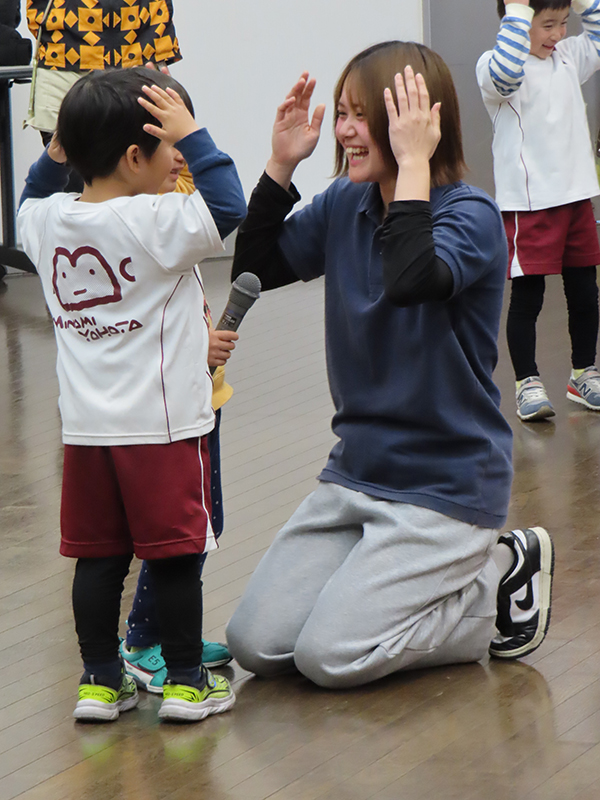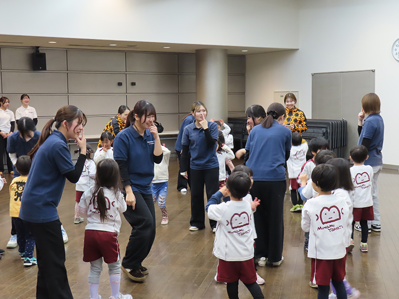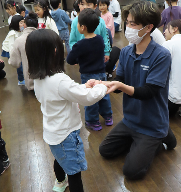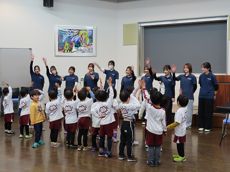 学生たちは、「1・2・3であそぼう」「あなたのお名前は」「ミッキーマウスマーチ」「鬼のパンツ」「貨物列車」「どうぶつ真似っこ遊び」などを、ピアノ伴奏に合わせて実施。体の部位に触れたり、ボディパーカッションやじゃんけんを取り入れたりしながら、園児たちと楽しく交流しました。進行役・手本役・伴奏者も学生が交代で担当し、最初は緊張した様子も見られましたが、曲が進むにつれて笑顔が増え、子どもたちもリラックスして楽しむ姿が印象的でした。