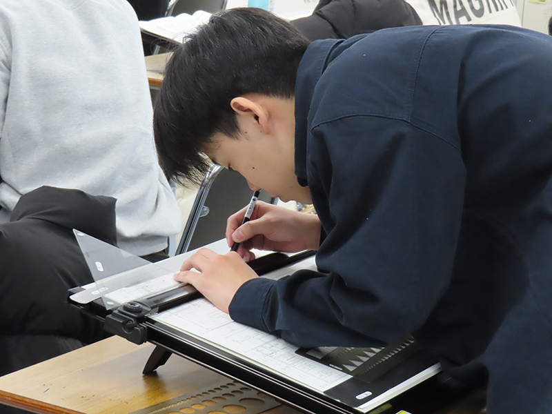 学生が描いた図面にも丁寧に目を通してくださり、 「線がとてもキレイに描けている」 「製図は自分の考えを整理するのにも良い。速さも身につけられると、さらに良くなる」 といった、実務経験に基づいた具体的なフィードバックをいただきました。