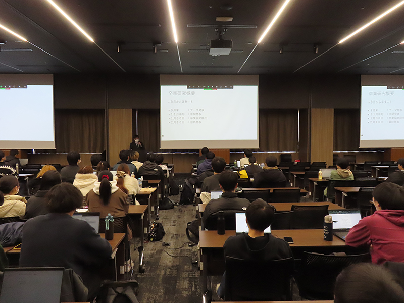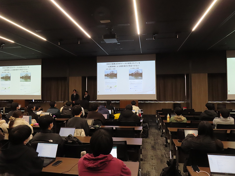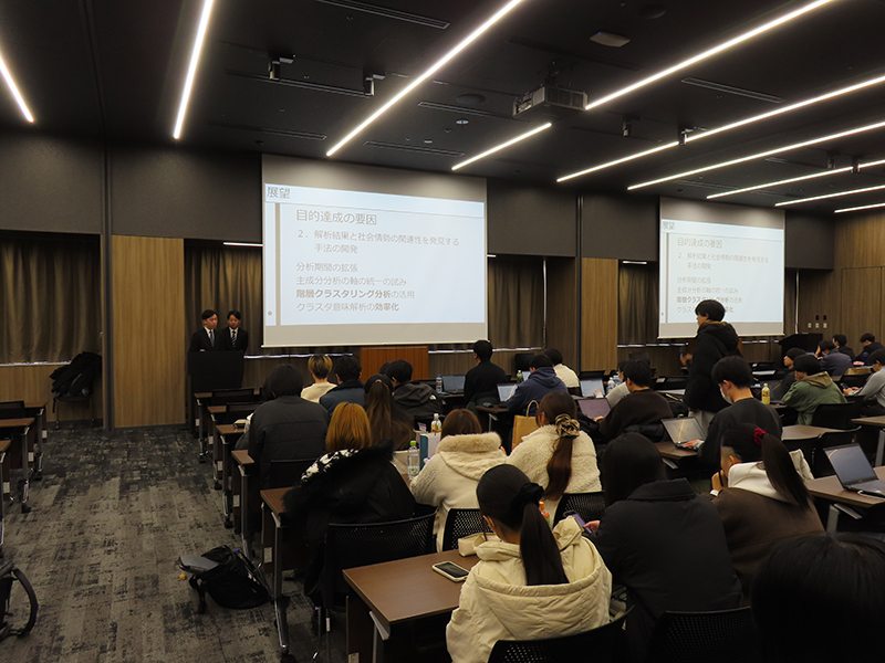 「ネットワークログ解析による大学へのサイバー攻撃傾向分析」「静岡点群データ活用によるSNS災害情報の位置推定」「海中サクラエビ漁業支援システムの開発」など、全11件の発表が行われ、どれも4年間の学びが丁寧にまとめられた内容でした!